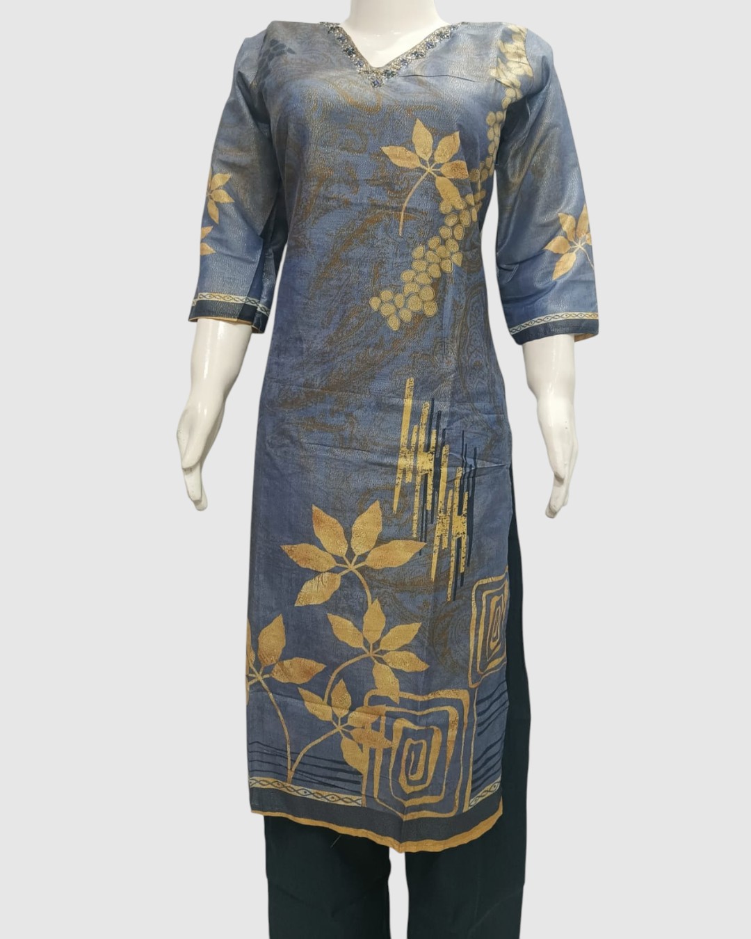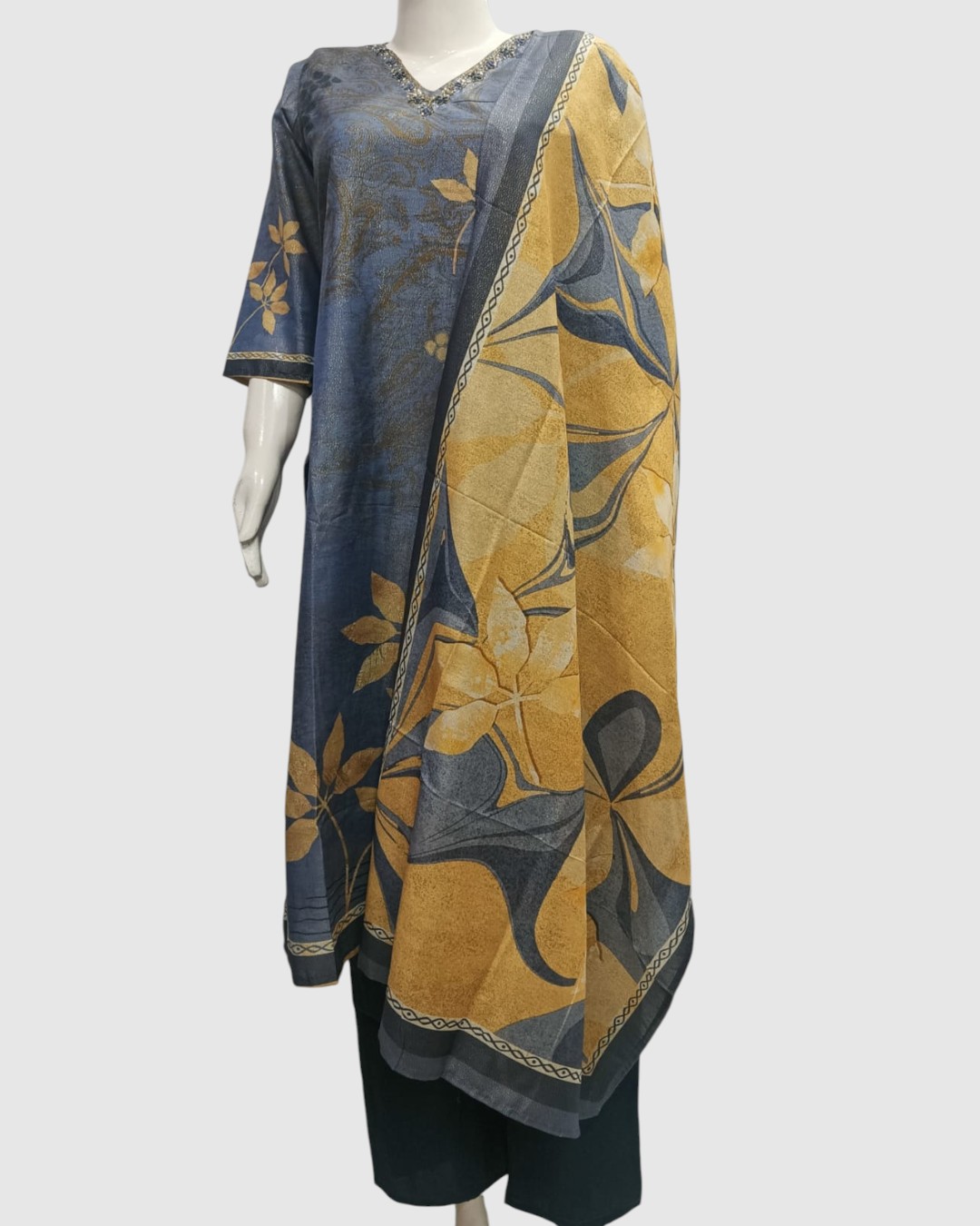 Elegant gray soft fabric suit set with stone work on the neckline, paired with a matching palazzo and dupatta. Available in M, L, XL, and XXL. Perfect festive & party wear.