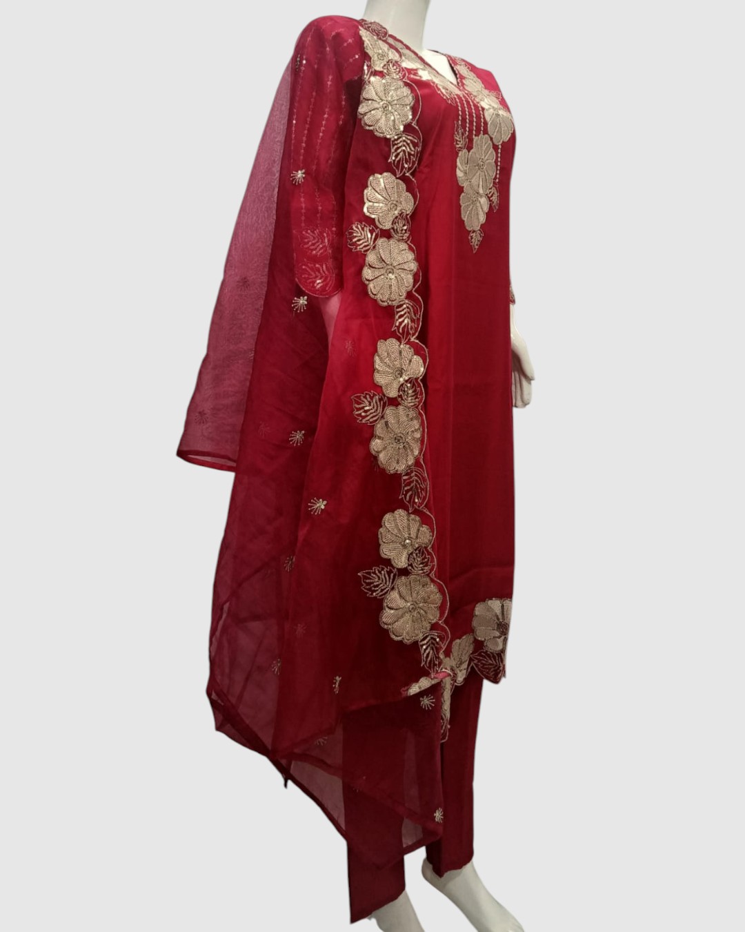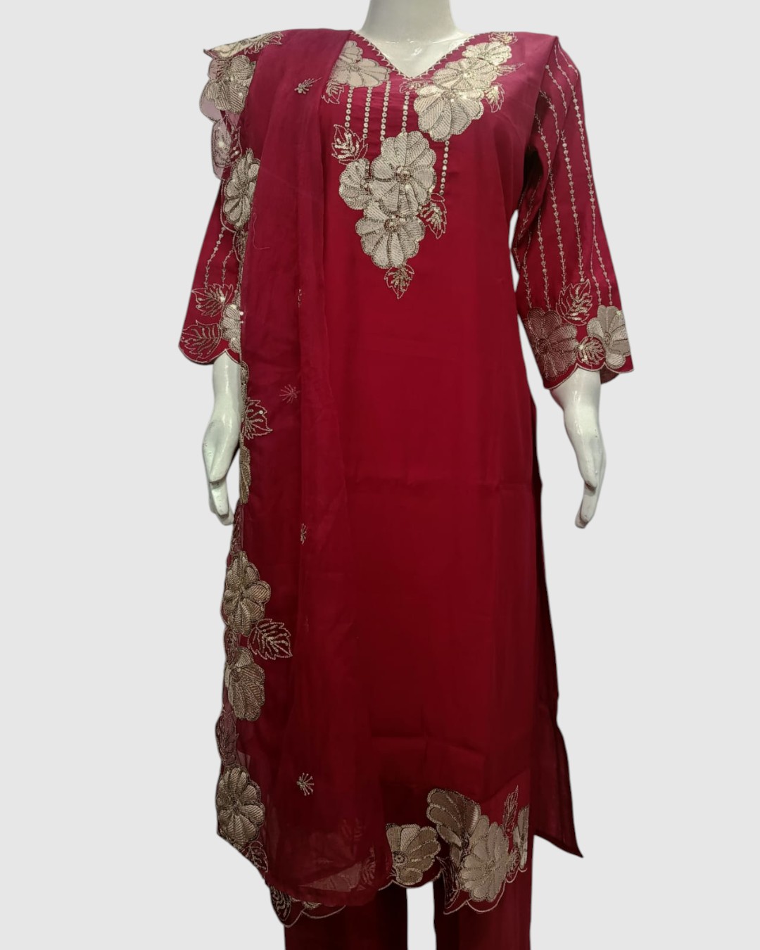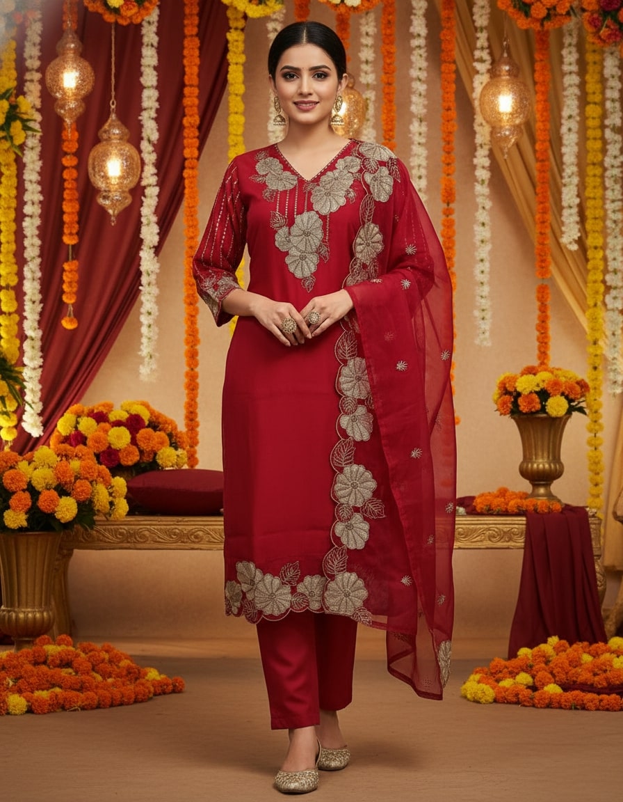 Make a stylish statement with this Magenta Romin Silk Suit Set, designed for modern elegance with a touch of tradition. The kurta is crafted from premium Romin silk, featuring fine embroidery details, complemented by a plain palazzo and a beautifully textured organza dupatta. Ideal for festive gatherings, wedding functions, or party wear.