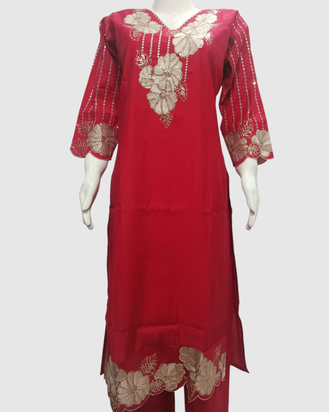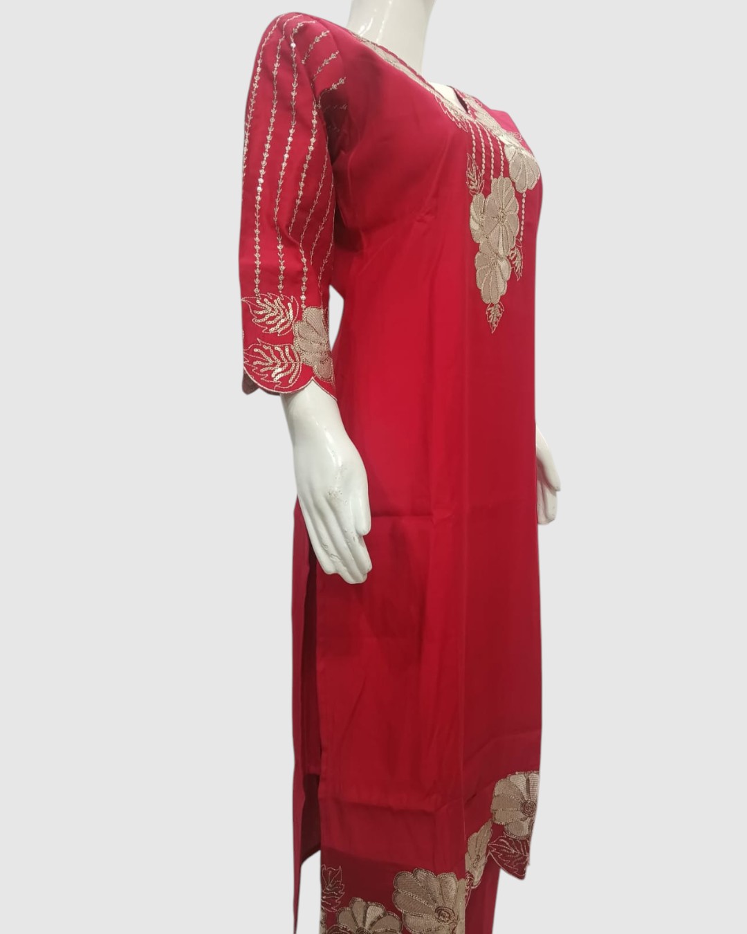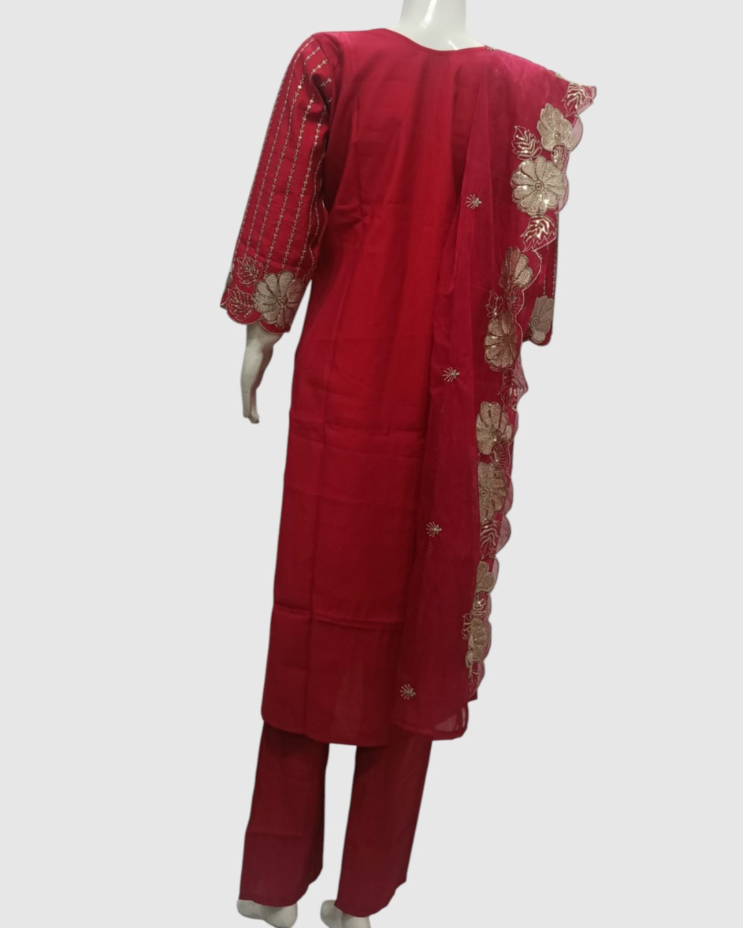 Make a stylish statement with this Magenta Romin Silk Suit Set, designed for modern elegance with a touch of tradition. The kurta is crafted from premium Romin silk, featuring fine embroidery details, complemented by a plain palazzo and a beautifully textured organza dupatta. Ideal for festive gatherings, wedding functions, or party wear.