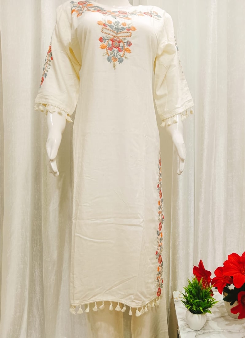 1 review for Elegant Off-White Pure Cotton Embroidered Kurta with Sequin Dupatta | Trendstox