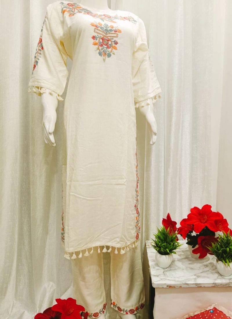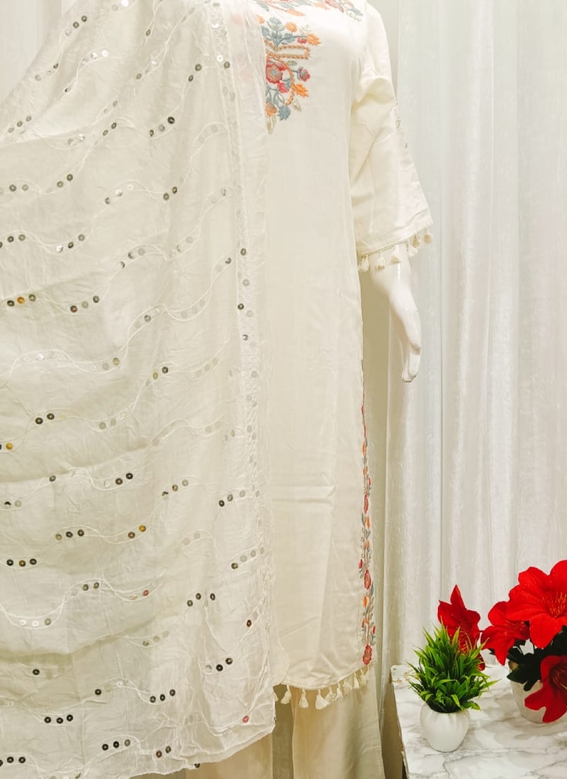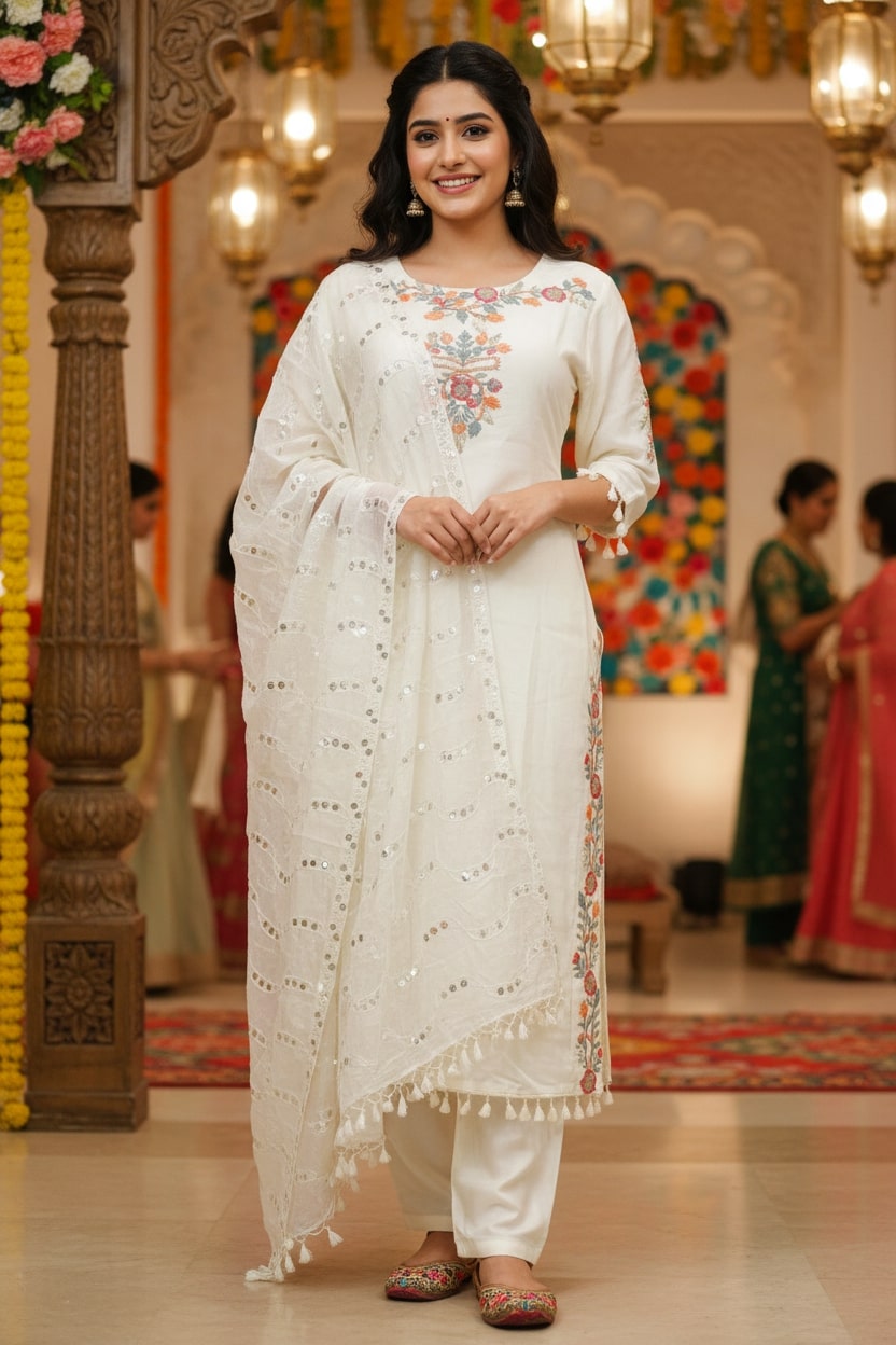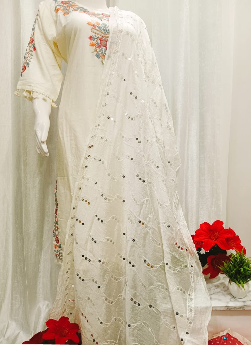 Off-white pure cotton kurta with intricate floral embroidery on neckline and sleeves, paired beautifully with a sequin-adorned dupatta — elegant and comfortable.